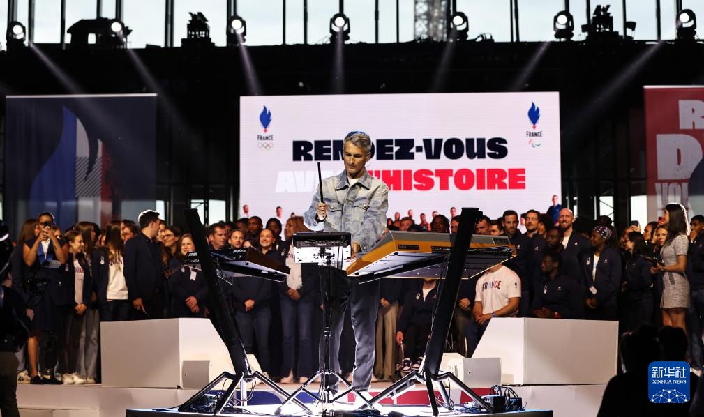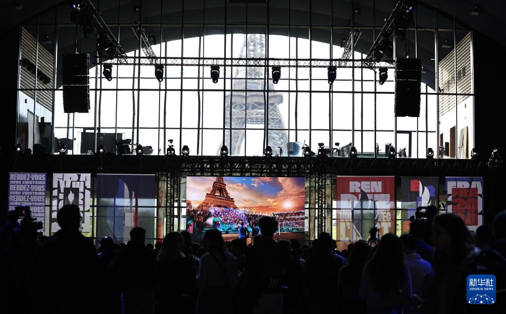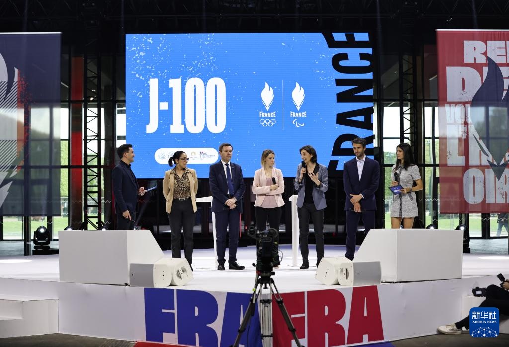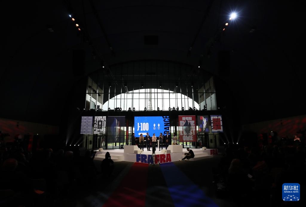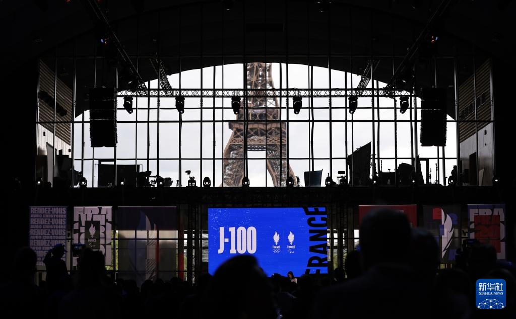 當日,巴黎奧運會倒計時100天慶祝活動在法國巴黎埃菲爾鐵塔附近的臨時大皇宮舉行。