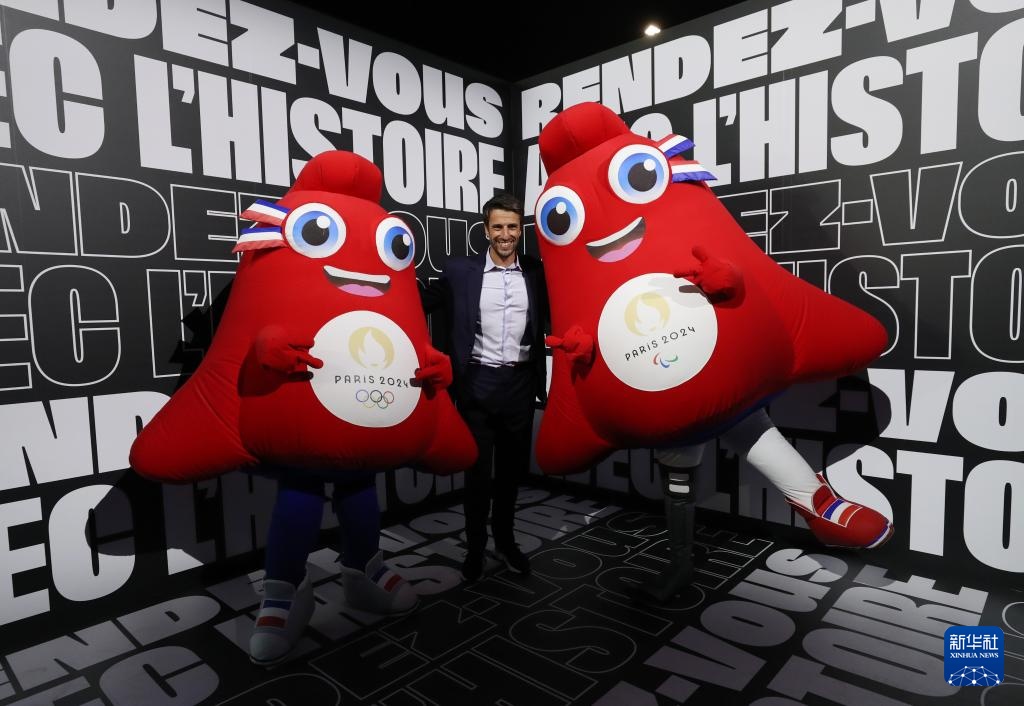 4月17日,巴黎奧組委主席托尼·埃斯坦蓋在慶祝活動中與巴黎奧運會和殘奧會吉祥物合影留念。新華社記者 高靜 攝