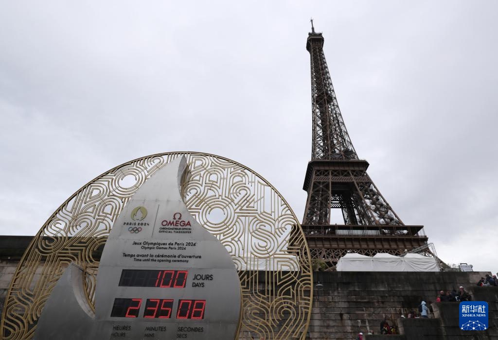 這是4月17日在法國巴黎埃菲爾鐵塔腳下拍攝的巴黎奧運會倒計時牌。新華社記者 高靜 攝