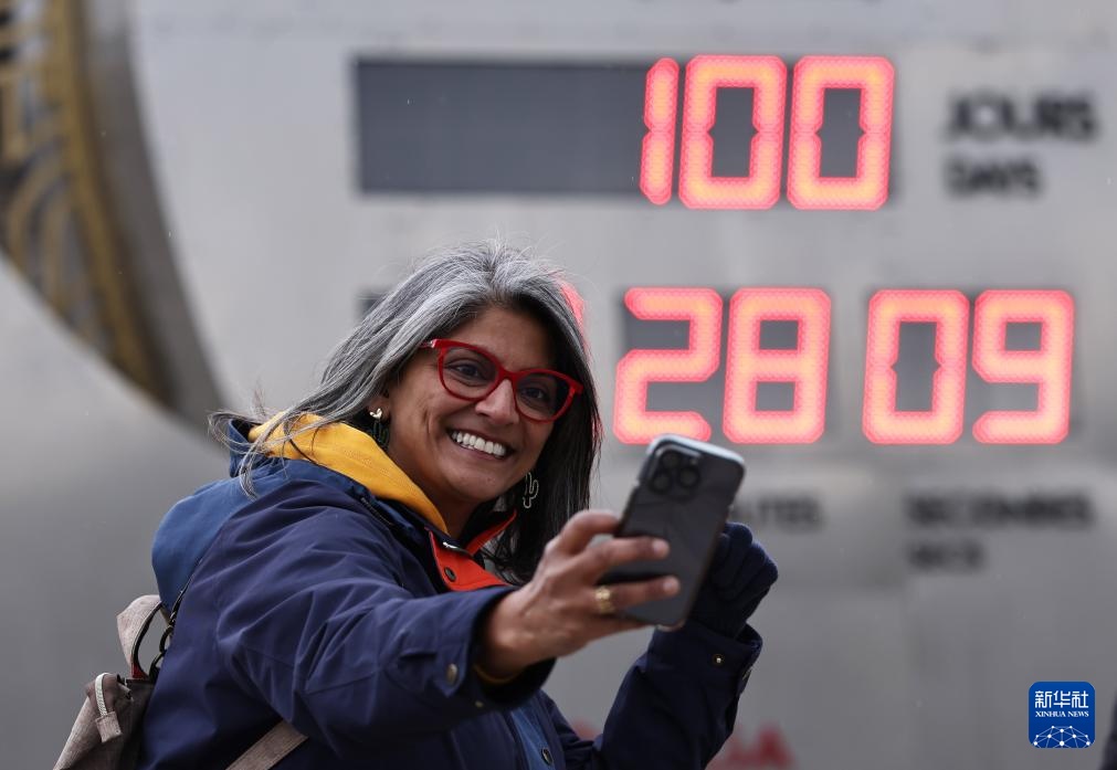4月17日,一位女士在法國巴黎埃菲爾鐵塔腳下與巴黎奧運會倒計時牌合影留念。新華社記者 高靜 攝