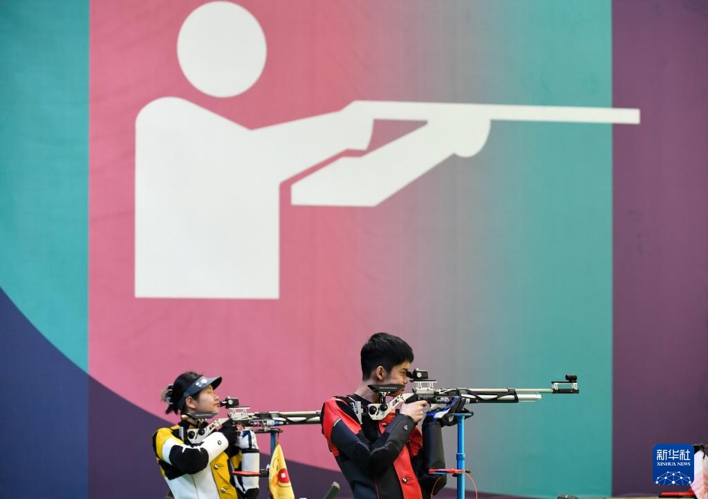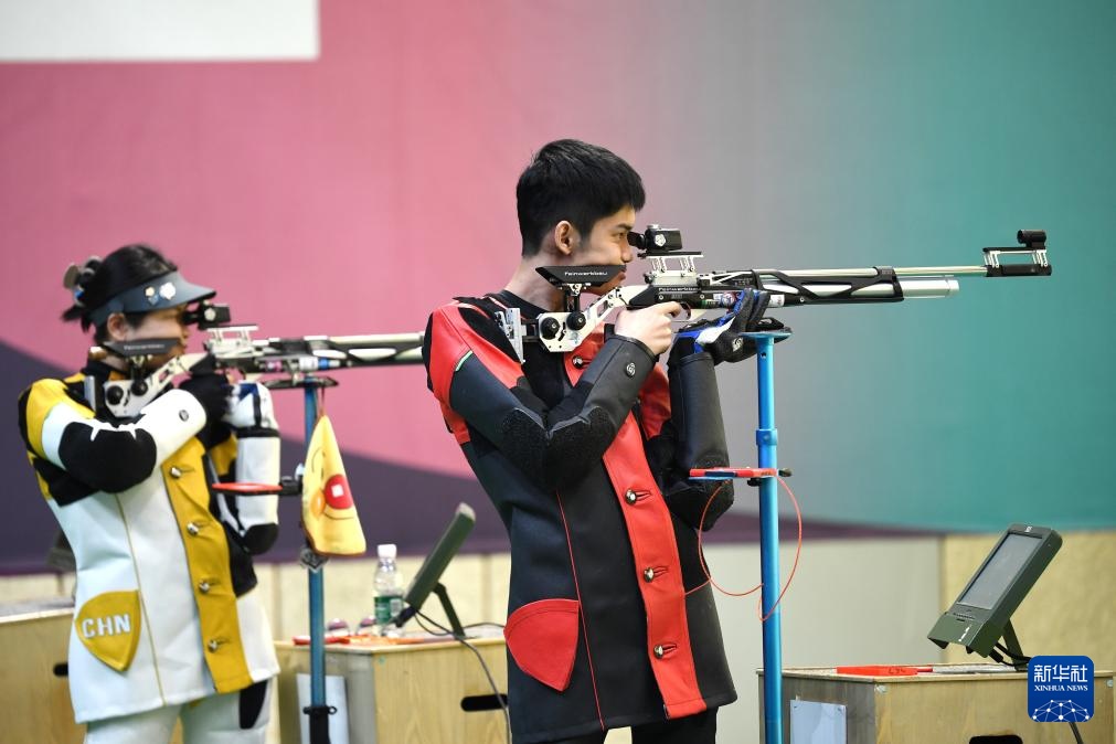 4月18日,盛李豪(右)在10米氣步槍個人訓練賽決賽中。新華社記者 鞠煥宗 攝