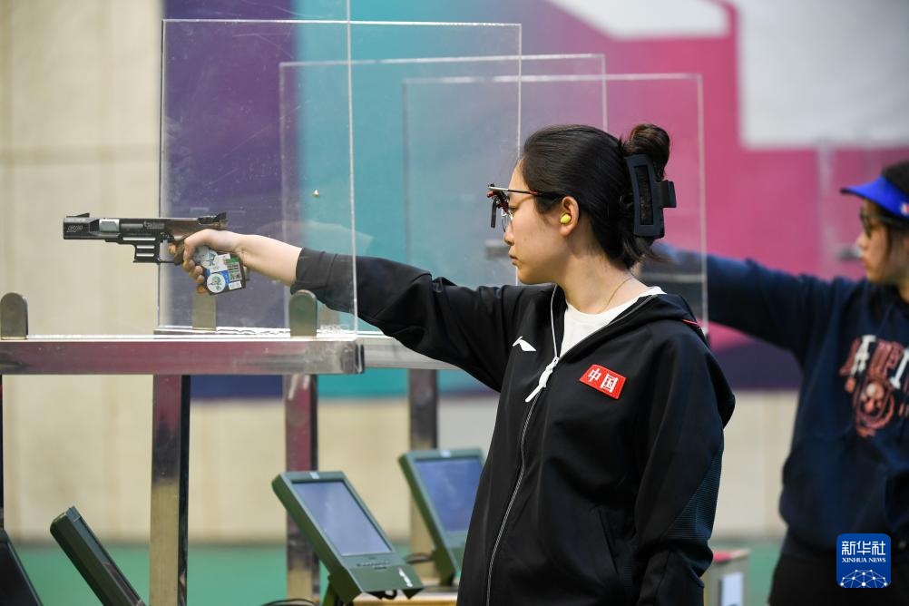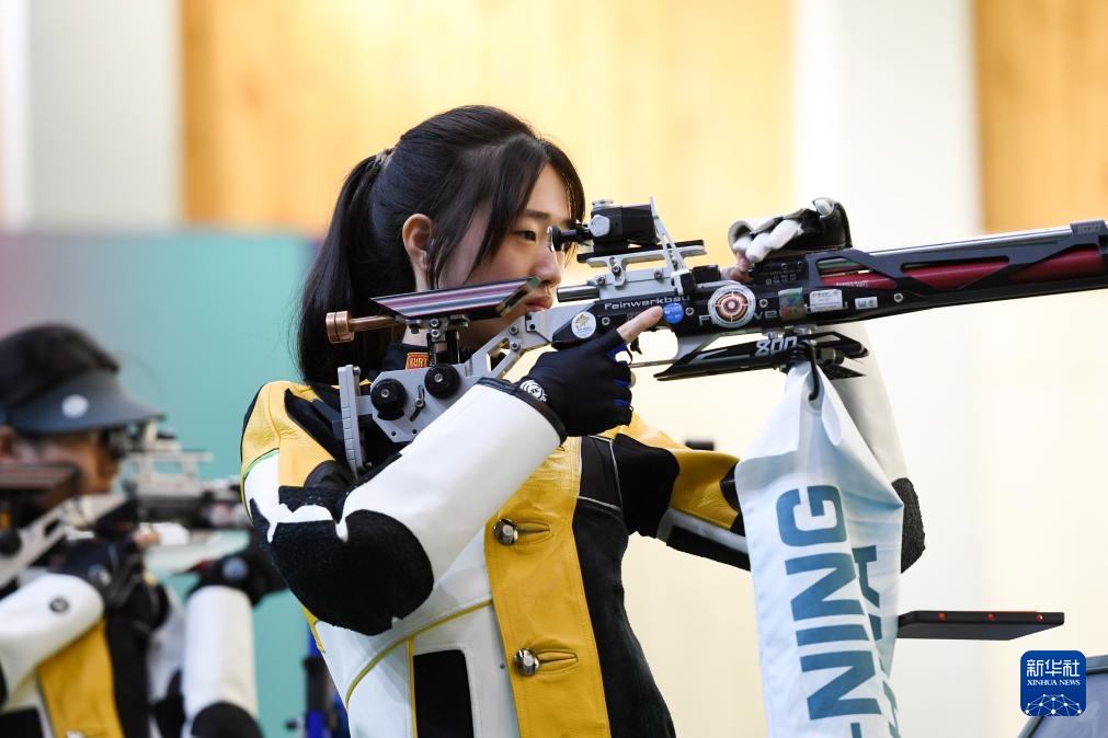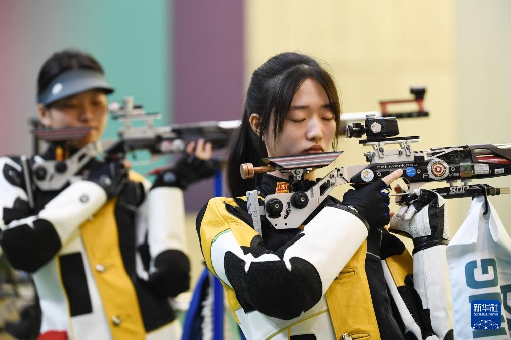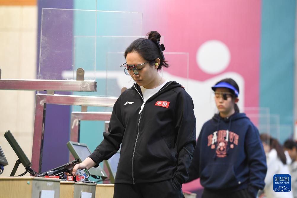 4月18日,黃雨婷(前)在10米氣步槍個人訓練賽決賽中。新華社記者 鞠煥宗 攝