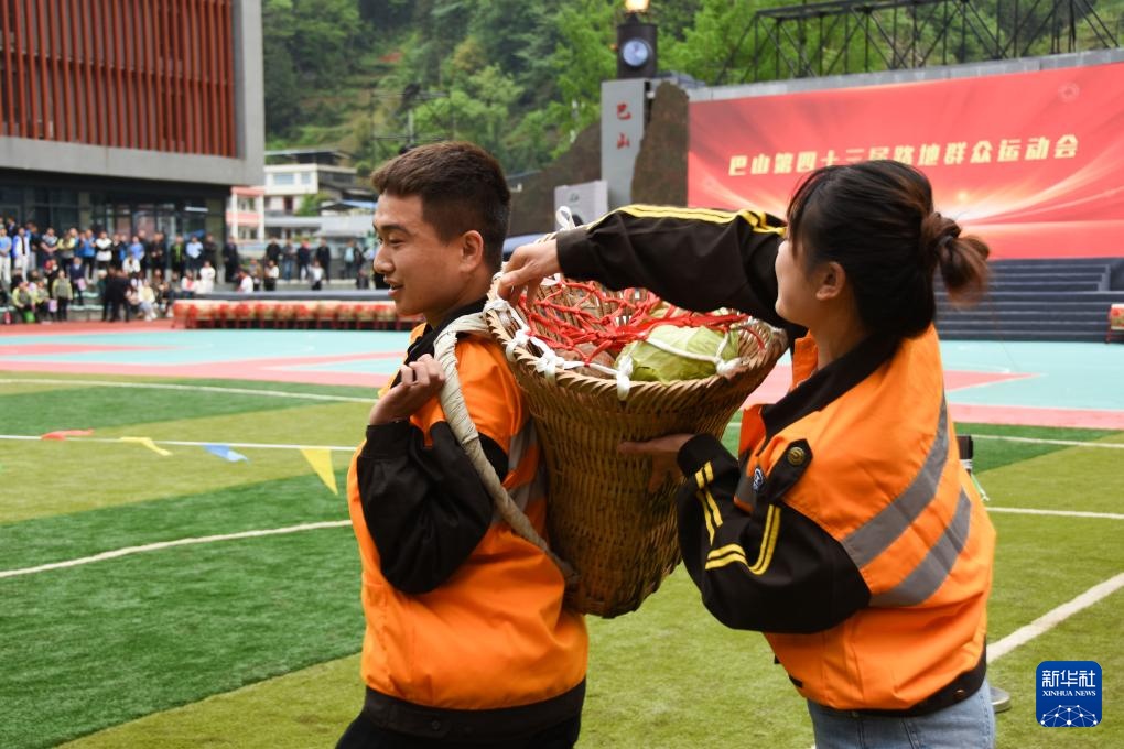 4月18日,參賽選手在運動會上參加背背簍比賽。