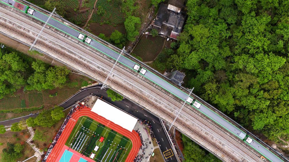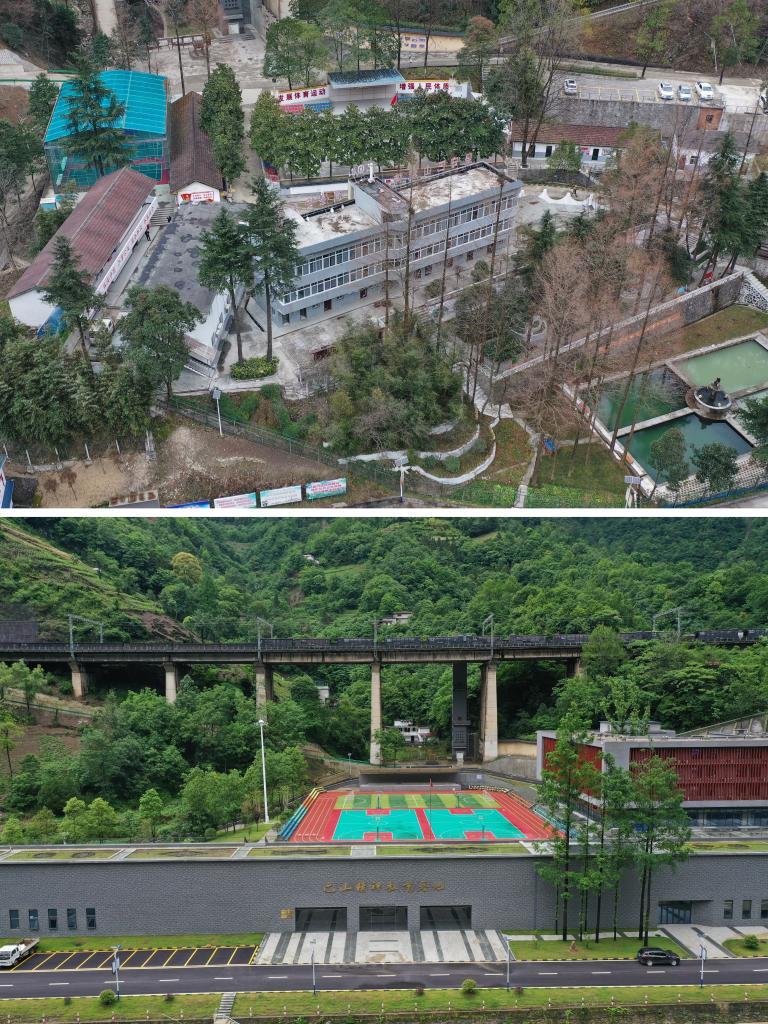 一聲聲吶喊,一陣陣歡笑,參賽者和觀眾沉浸在體育運動的激情中。在他們身后,是為運動會設計的一塊大巴山造型的背景板:山體兩側,開進隧洞時的綠皮車,在沖出隧洞時已是“復興號”。