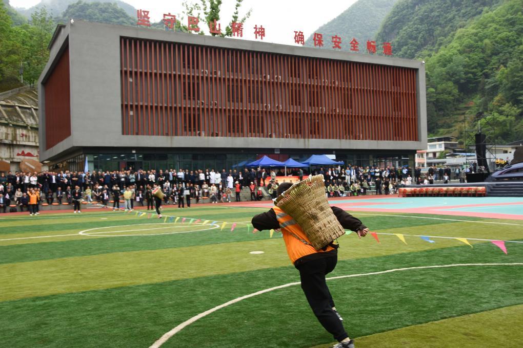 4月18日,參賽選手在運動會上參加背背簍比賽。新華社記者 林勝概 攝