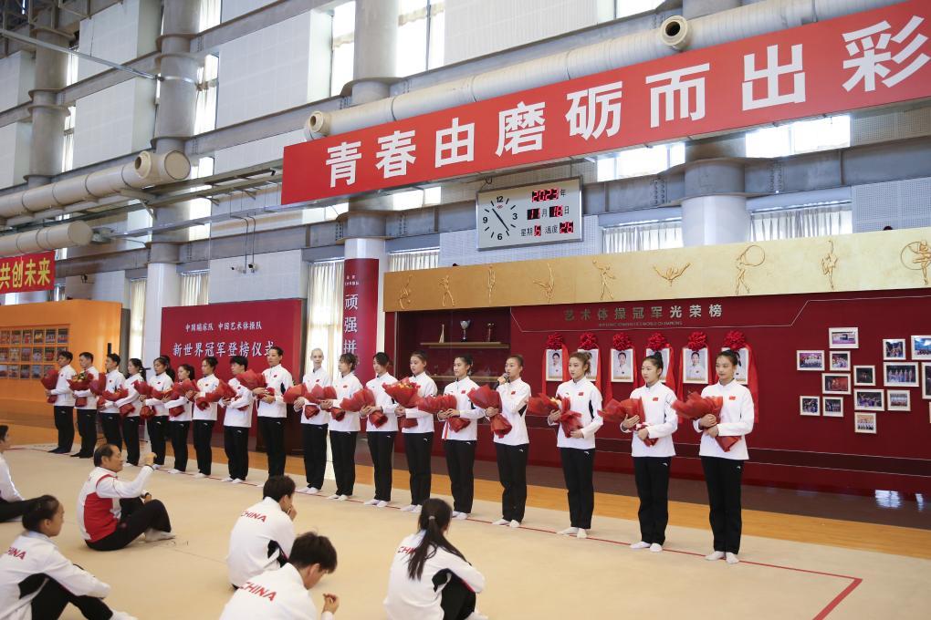 2023年11月18日,奪得世界冠軍的中國蹦床隊、中國藝術體操隊運動員及其教練員在新世界冠軍登榜儀式上接受祝賀。新華社記者 許雅楠 攝