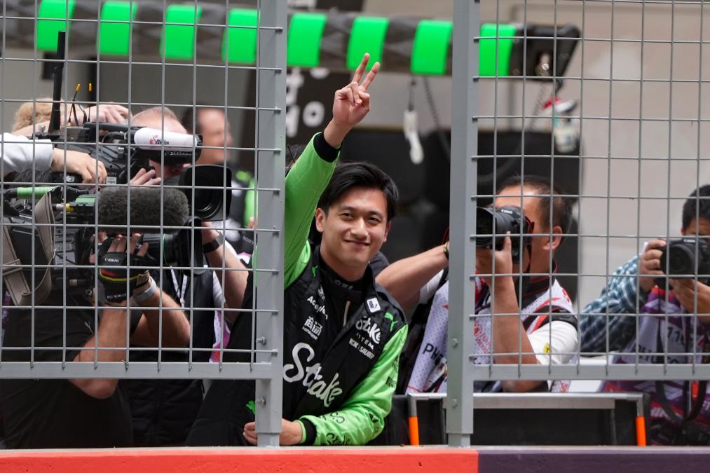 4月19日,索伯車隊中國車手周冠宇(中)在練習賽前向觀眾致意。新華社記者 夏一方 攝