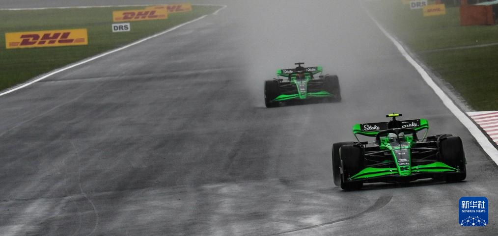 4月19日,索伯車隊中國車手周冠宇(前)和隊友芬蘭車手博塔斯在比賽中。周冠宇最終排名第十,博塔斯排名第九。新華社記者 夏一方 攝