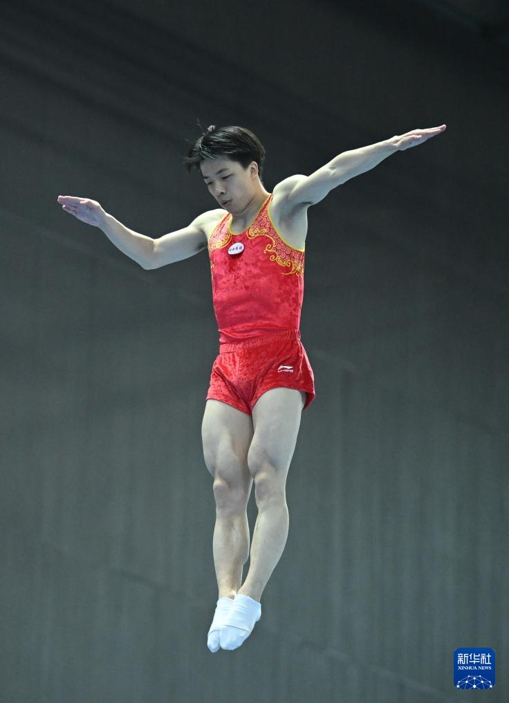 4月19日,湖南高速蹦床隊選手賀龍雨在比賽中。新華社記者 孫凡越 攝