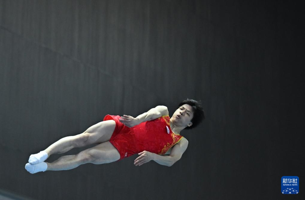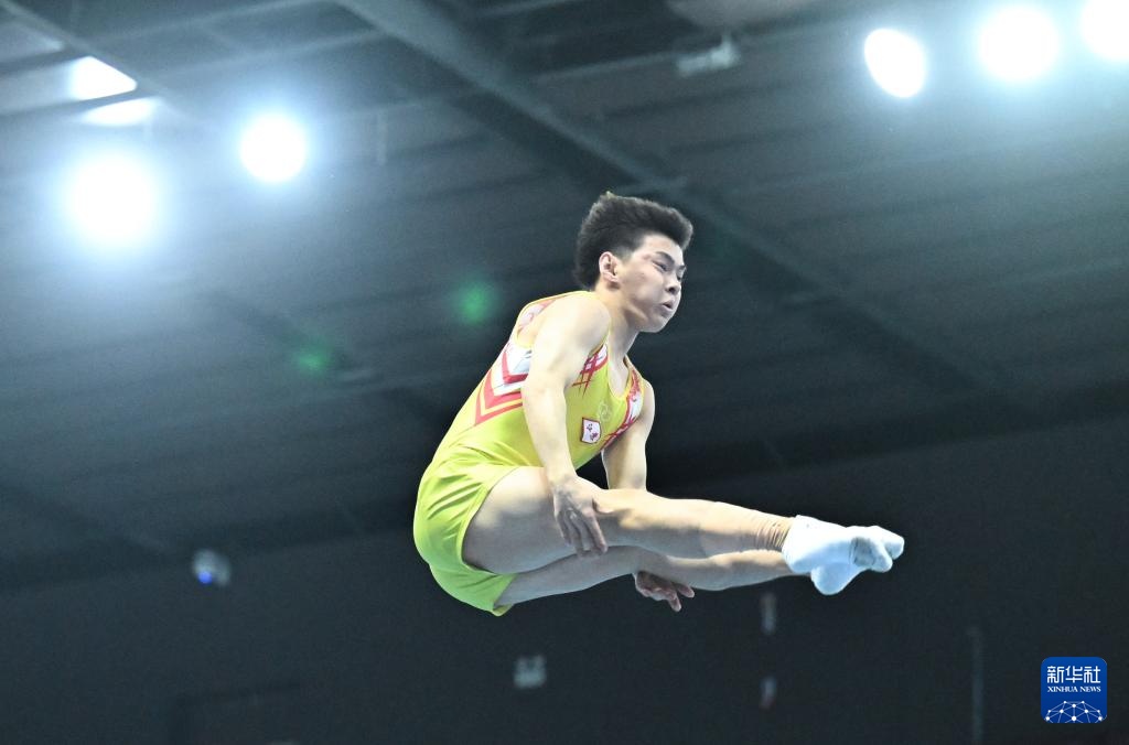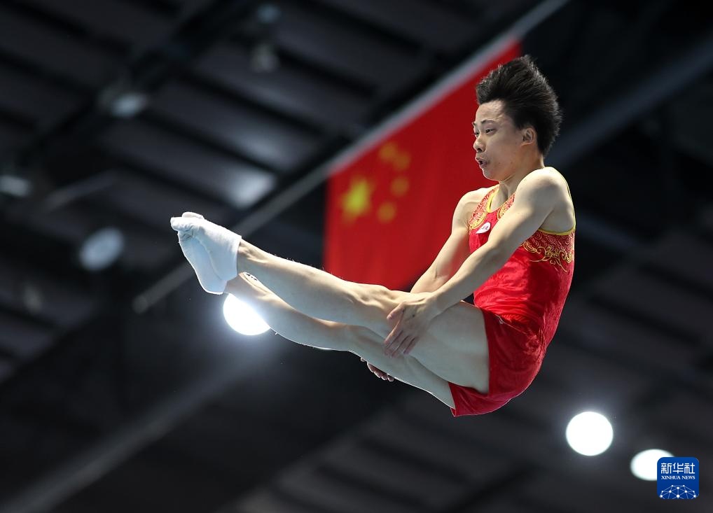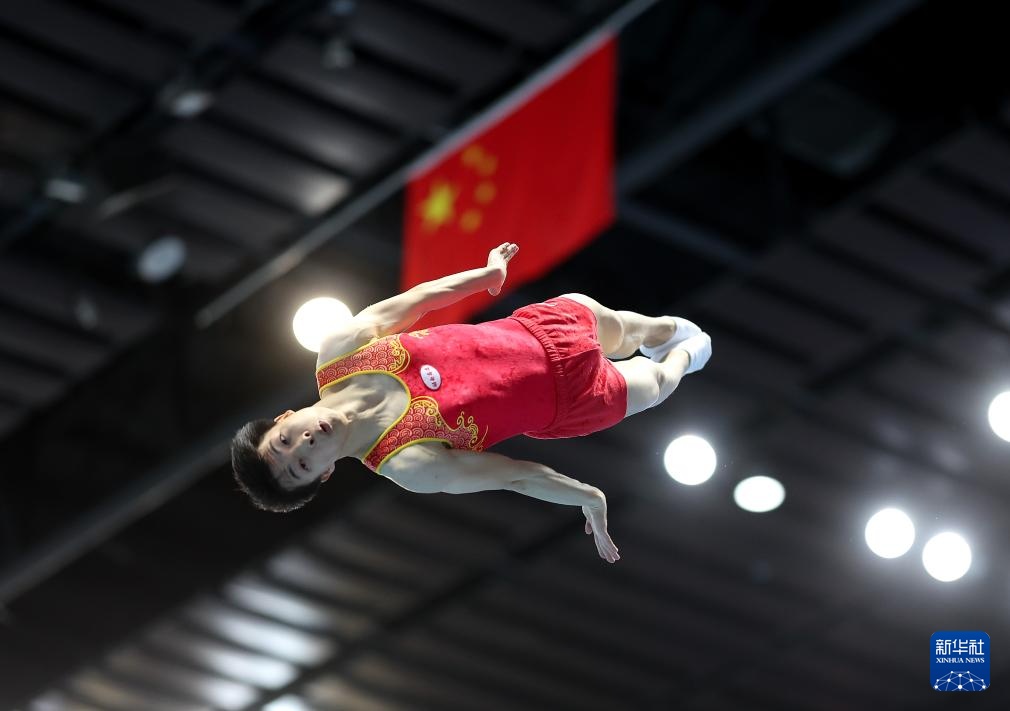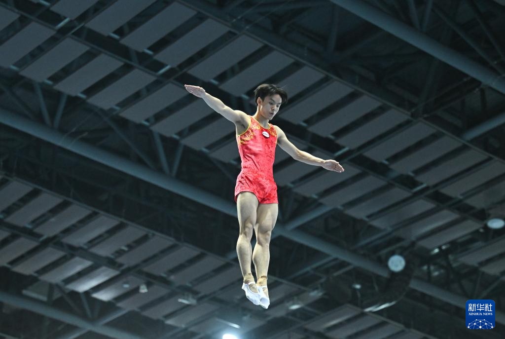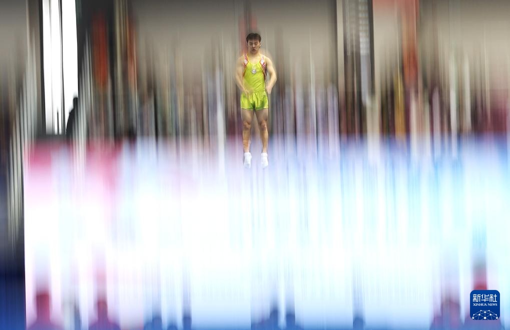 4月19日,江蘇蹦床隊選手王梓賽在比賽中。新華社記者 孫凡越 攝