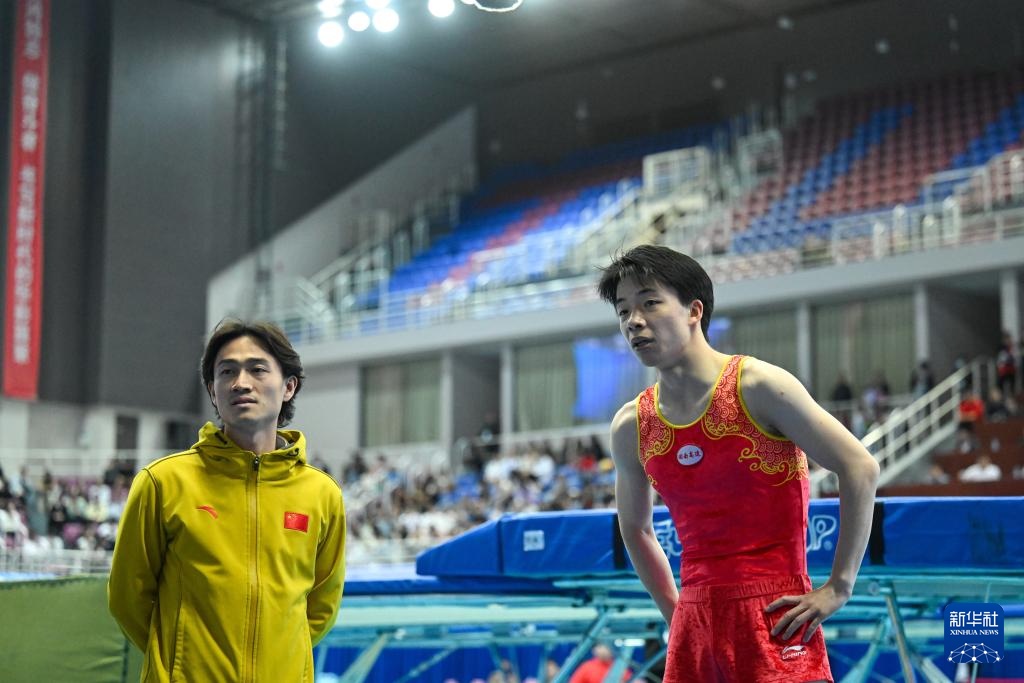 4月19日,湖南高速蹦床隊選手嚴浪宇(右)與教練李倫在比賽結束后觀看錄像回放。新華社記者 孫凡越 攝