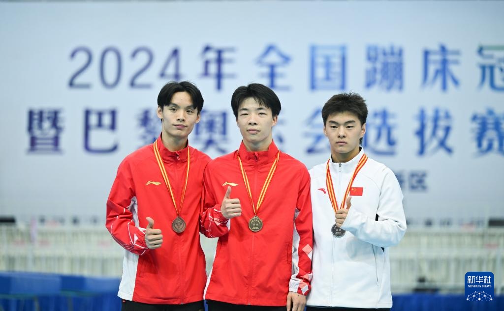 4月19日,冠軍湖南高速蹦床隊選手嚴浪宇(中)、亞軍江蘇蹦床隊選手王梓賽(右)、季軍湖南高速蹦床隊選手賀龍雨在頒獎儀式上合影。新華社記者 孫凡越 攝