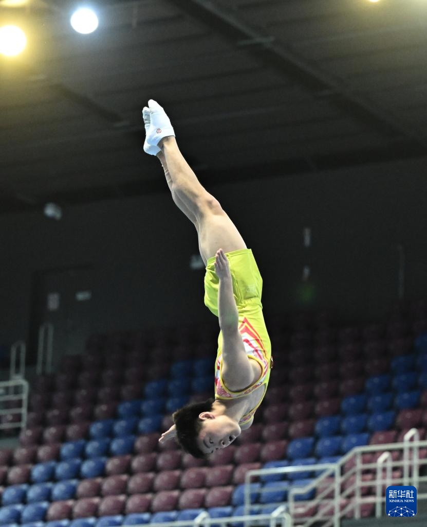 4月19日,江蘇蹦床隊選手王梓賽在比賽中。新華社記者 曹燦 攝