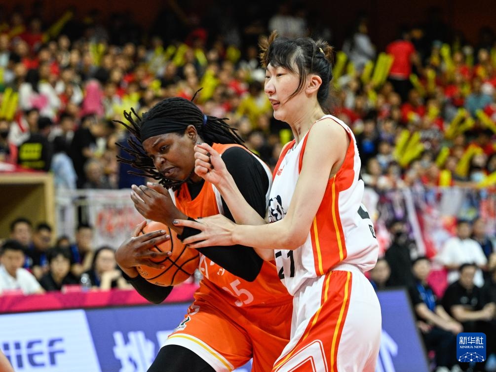 4月19日,內蒙古農信隊球員孫夢然(右)與四川遠達美樂隊球員坎貝奇在比賽中拼搶。新華社記者 王曦 攝