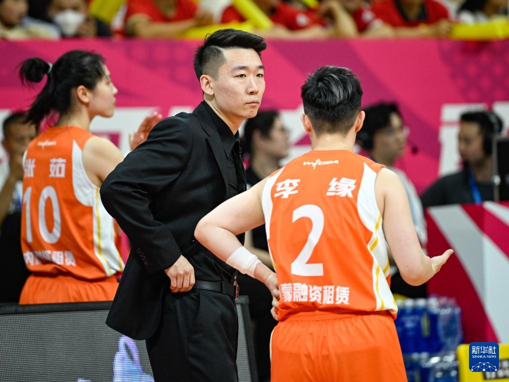 4月19日,內蒙古農信隊主教練楊贊(左)在比賽中指導球員李緣。新華社記者 王曦 攝