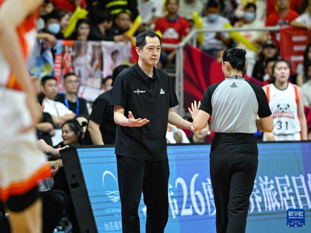 4月19日,四川遠達美樂隊球員王思雨(右)在比賽中和裁判交流。新華社記者 王曦 攝