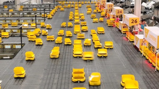 2023年11月8日,浙江湖州,德清縣乾元鎮第一產業智慧物流園區內,智能分揀機器人“小黃人”正在工作。