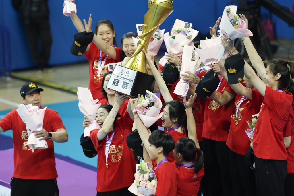 2月3日,天津渤海銀行隊在2023-2024賽季中國女排超級聯賽頒獎儀式上高舉冠軍獎杯慶祝。新華社發(海沙爾攝)