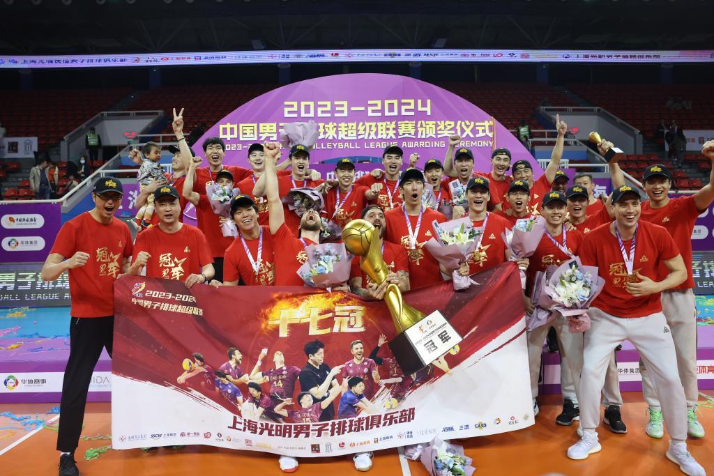 4月14日,上海光明隊成員在2023-2024中國男子排球超級聯賽頒獎儀式上慶祝。新華社發(海沙爾攝)