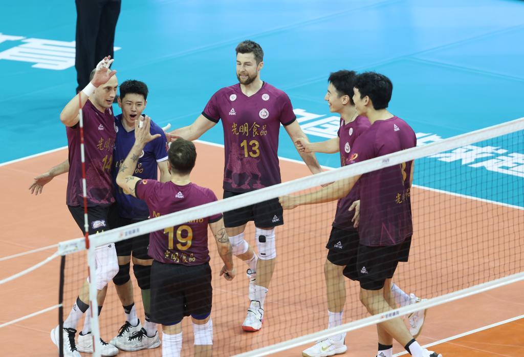 4月14日,上海光明隊球員在2023-2024中國男子排球超級聯賽決賽第三回合比賽中慶祝得分。新華社發(海沙爾攝)