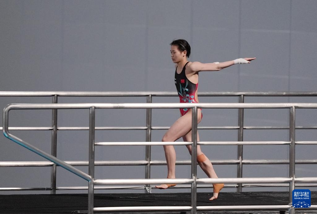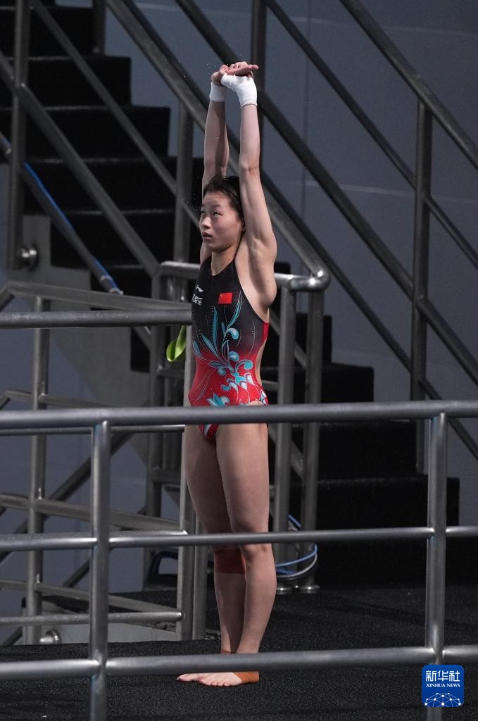4月21日,陳芋汐(右)、全紅嬋(中)和斯彭多利尼·西里埃在比賽間隙。