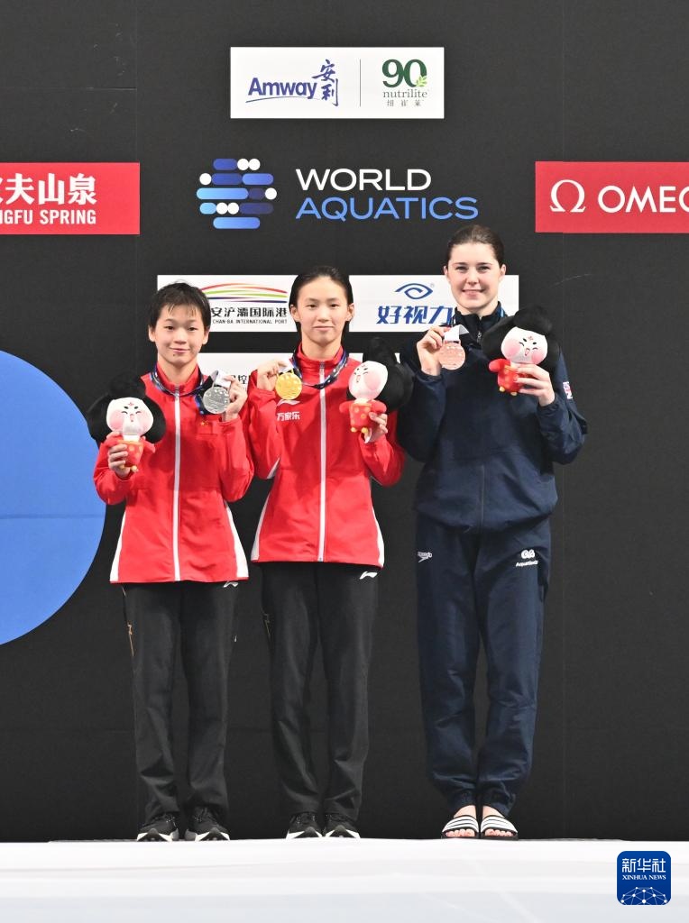 4月21日,陳芋汐(中)、全紅嬋(左)與斯彭多利尼·西里埃在頒獎儀式上。