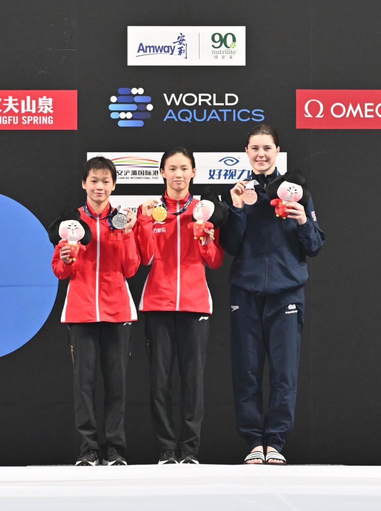 4月21日,陳芋汐(中)、全紅嬋(左)與西里埃在頒獎儀式上。新華社記者 張博文 攝