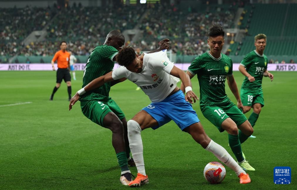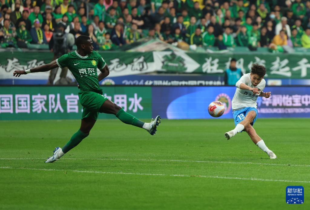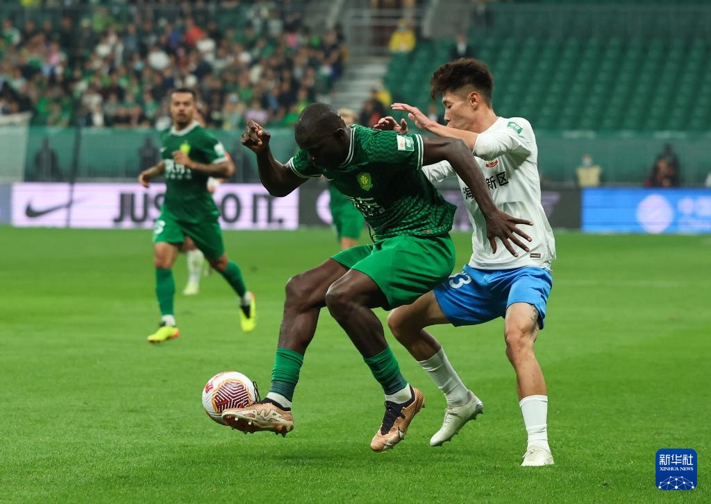 4月21日,北京國安隊(duì)球員恩加德烏(左)在比賽中拼搶。新華社記者 王楷焱 攝