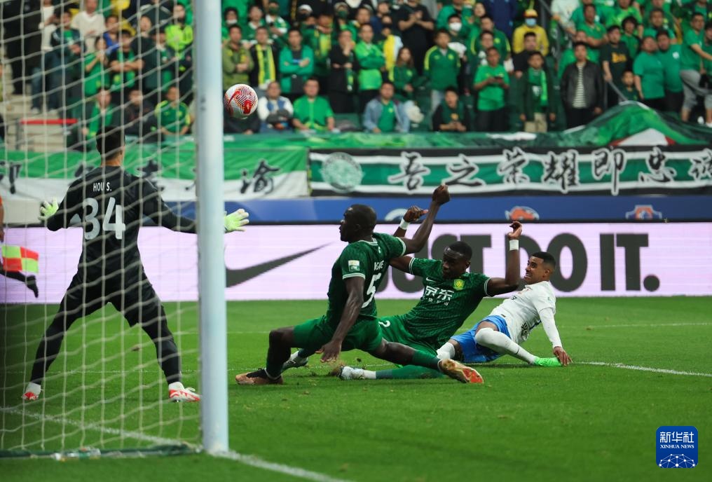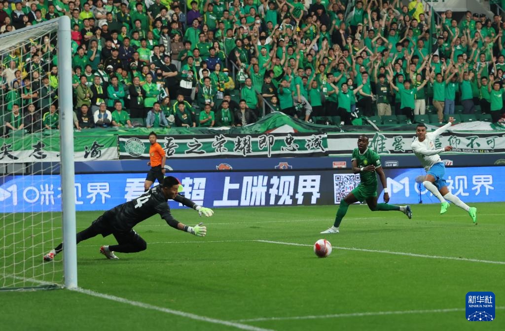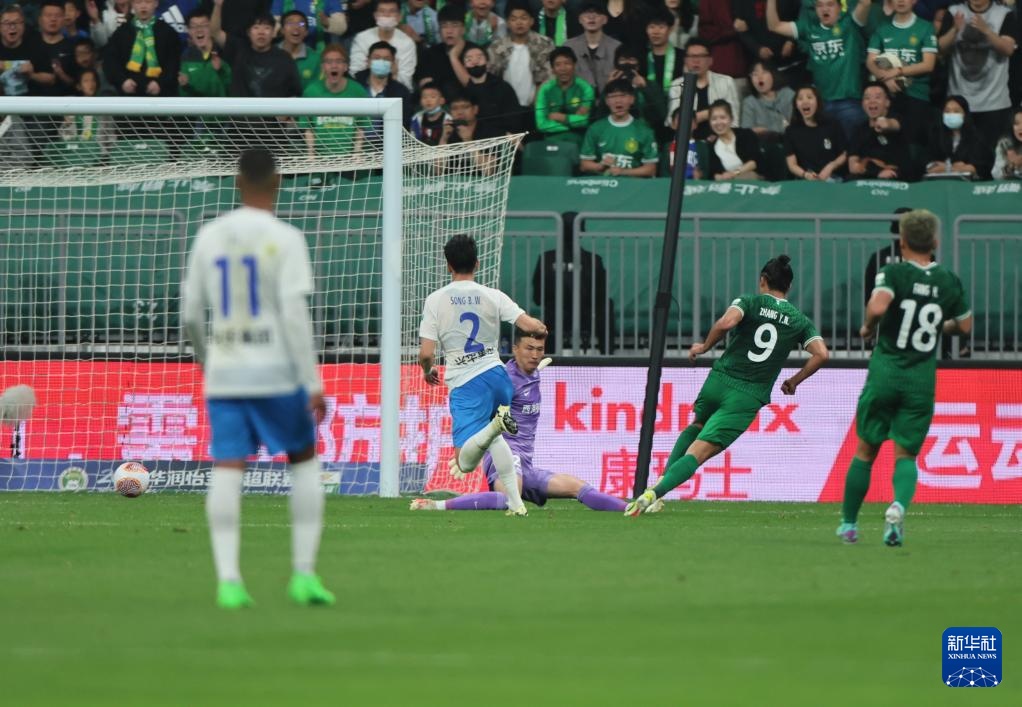4月21日,北京國安隊(duì)球員張玉寧(右二)在比賽中射門得分,該進(jìn)球隨后被取消。新華社記者 王楷焱 攝