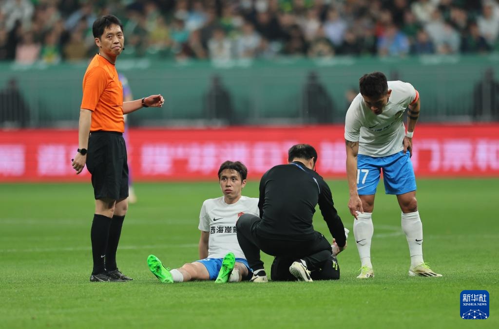 4月21日,青島西海岸隊(duì)球員張修維(左二)在比賽中受傷。新華社記者 王楷焱 攝