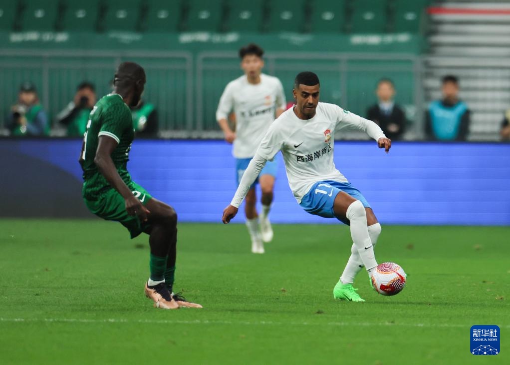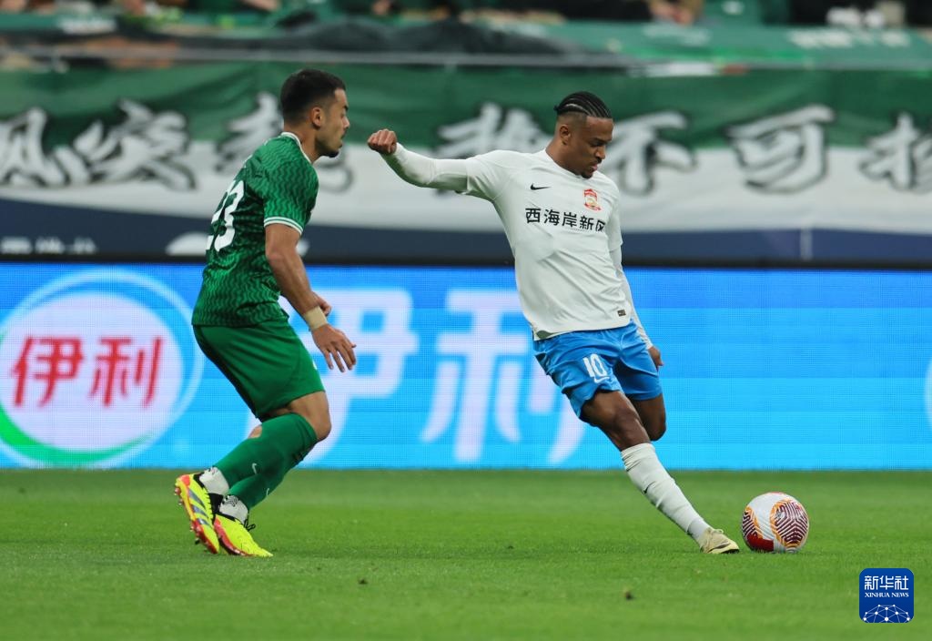 4月21日,青島西海岸隊(duì)球員阿蘭(右)在比賽中進(jìn)攻。新華社記者 王楷焱 攝
