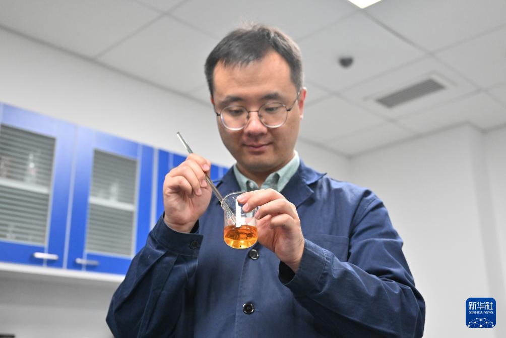 高學淼在實驗室內通過添加顯色劑準備檢測紙張纖維數據值(4月18日攝)。
