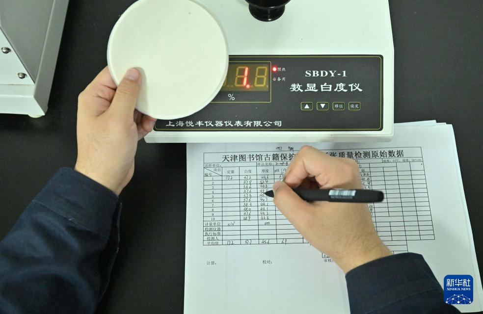 在天津圖書館天津市古籍保護中心,高學淼穿著工裝,在實驗室內的儀器設備間忙碌著,對不同的紙樣樣本進行數據檢測。“這是古籍修復的‘前奏’,目的是尋找最接近古籍用紙的材料,以便達到最佳的修書效果。”高學淼說。