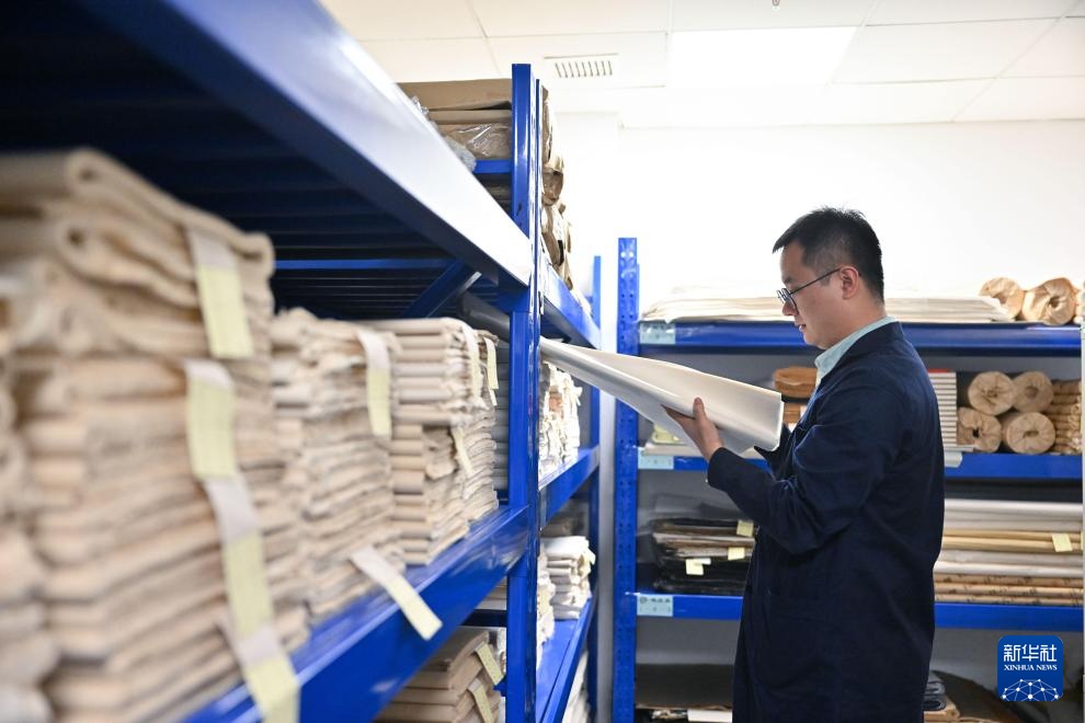 高學淼在紙庫中尋找適合修復的用紙材料,準備取樣后運往實驗室進行檢測(4月22日攝)。
