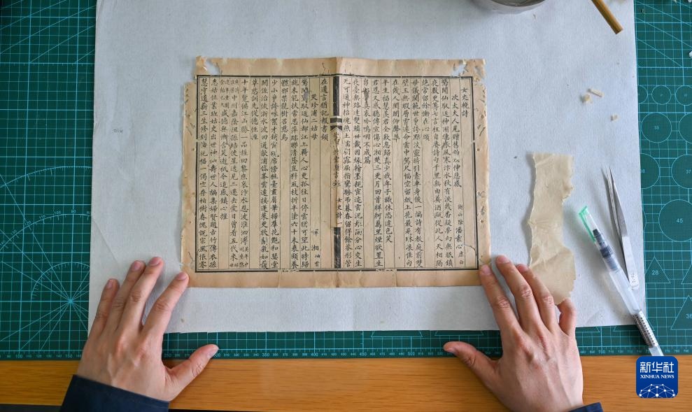 天津圖書館的古籍修復師用補紙在古籍背面進行修復作業(4月22日攝)。