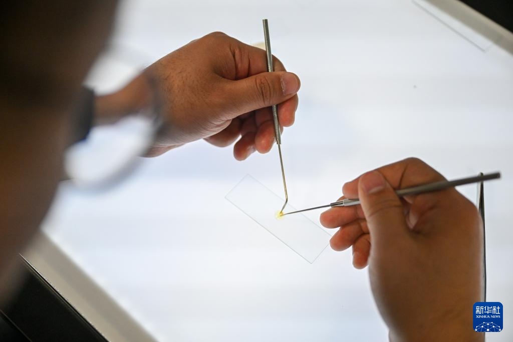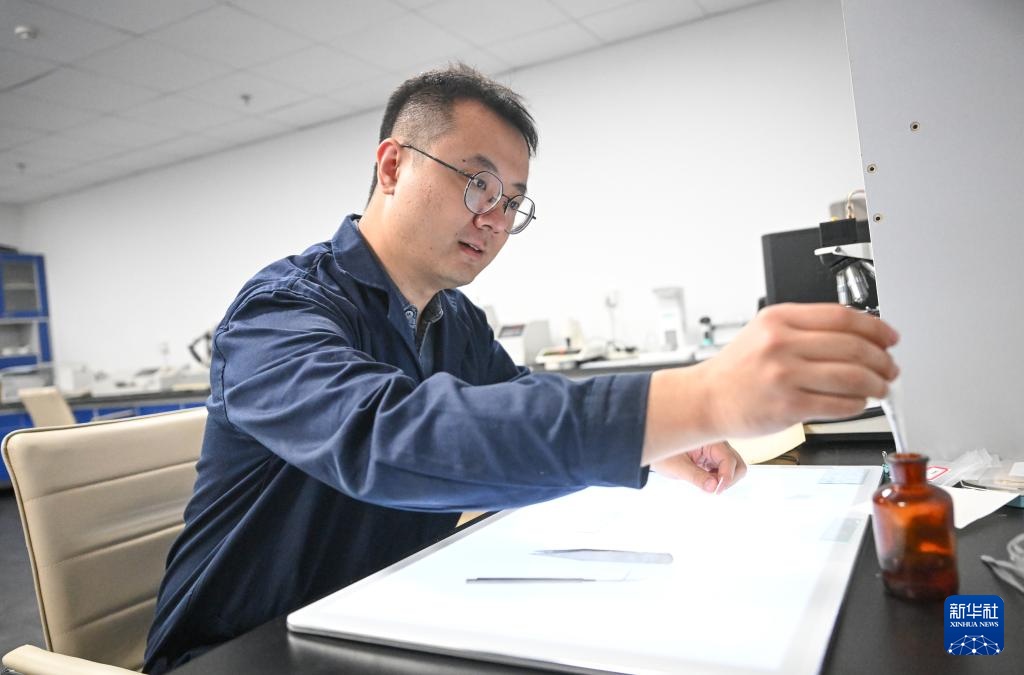 高學淼在實驗室內將紙樣放置于載玻片上,準備通過儀器檢測紙張纖維數據值(4月18日攝)。