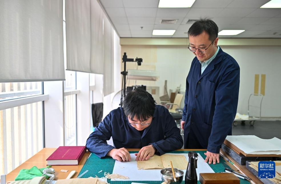 在天津圖書館古籍修復室,高學淼(右)在一名實習生修復古籍時駐足觀看,并不時指導(4月22日攝)。