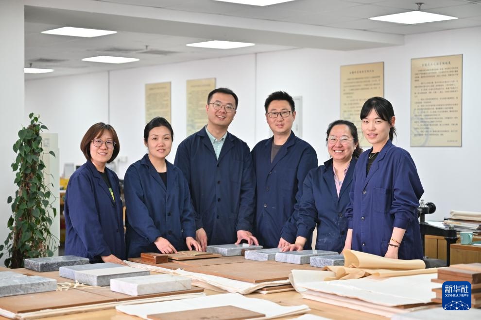 高學淼(左三)和天津圖書館古籍文獻部古籍修復組部分同事合影(4月22日攝)。