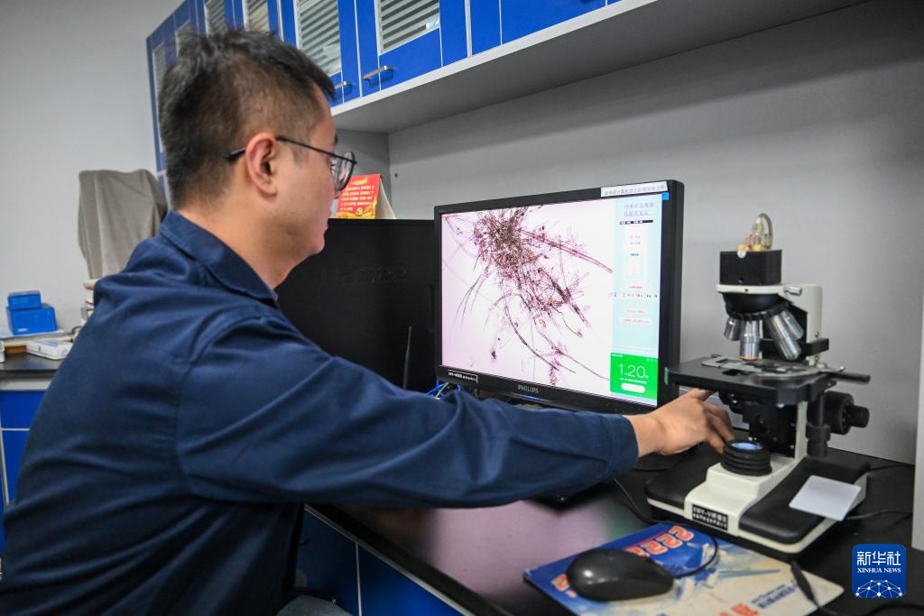 高學淼在實驗室內通過實驗儀器檢測紙張纖維數據值(4月18日攝)。