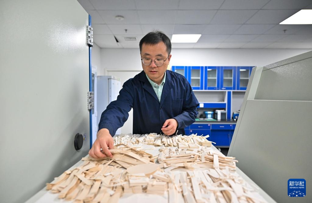 高學淼在實驗室內對不同紙樣進行挑選(4月22日攝)。