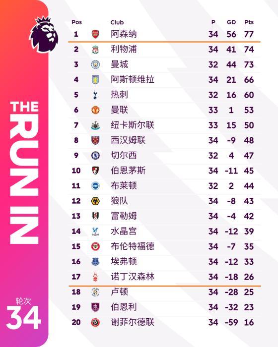 目前利物浦積74分位列英超第二,距離榜首的阿森納差3分,領先少賽兩場的曼城1分。在僅剩4輪英超比賽的情況下,利物浦已經基本從英超冠軍爭奪中掉隊。