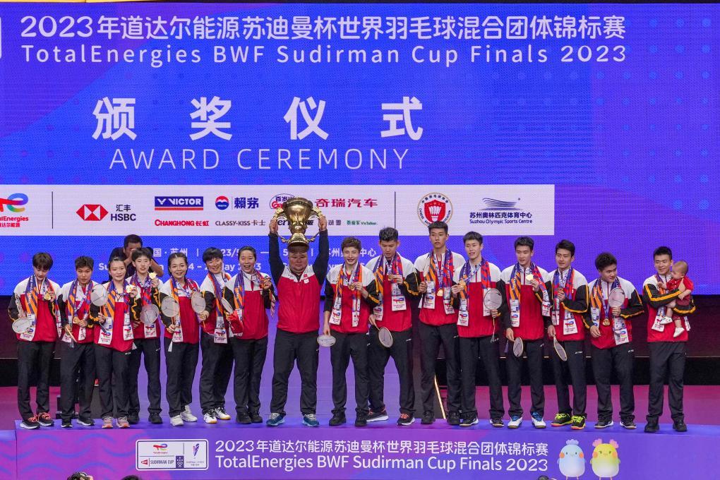 2023年蘇迪曼杯世界羽毛球混合團(tuán)體錦標(biāo)賽頒獎(jiǎng)儀式在江蘇省蘇州市舉行。中國(guó)隊(duì)在決賽中以3比0戰(zhàn)勝韓國(guó)隊(duì),奪得冠軍。新華社記者 李博 攝