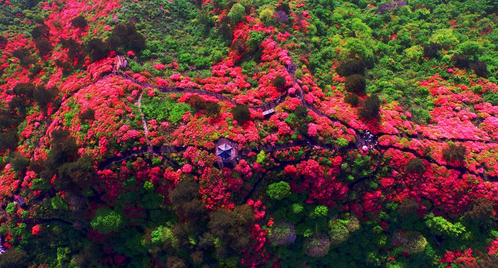 人間四月天,麻城看杜鵑。近幾天,龜峰山上杜鵑花已經盛開,漫山如霞似錦,整個山巒被紅地毯般的杜鵑花所覆蓋,變為一片紅色的海洋,猶如一條壯觀的紅飄帶。