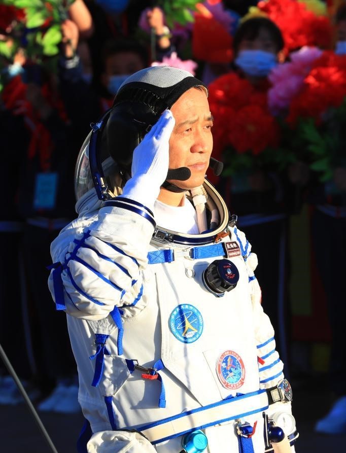 2021年6月17日,神舟十二號航天員出征儀式在酒泉衛星發射中心舉行。這是航天員聶海勝在出征儀式上敬禮。新華社記者 琚振華 攝