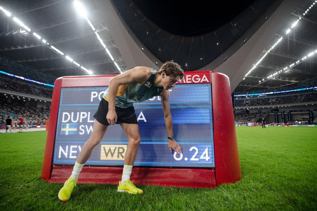 2024年4月20日瑞典選手杜普蘭蒂斯在賽后觸摸顯示新世界紀錄的記分牌。新華社記者 江漢 攝