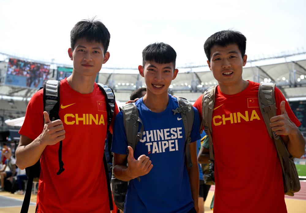 2023年8月23日,中國選手張溟鯤(左)、張景強(右)與中國臺北選手林昱堂在2023世界田徑錦標賽男子跳遠資格賽后合影。新華社記者 宋彥樺 攝