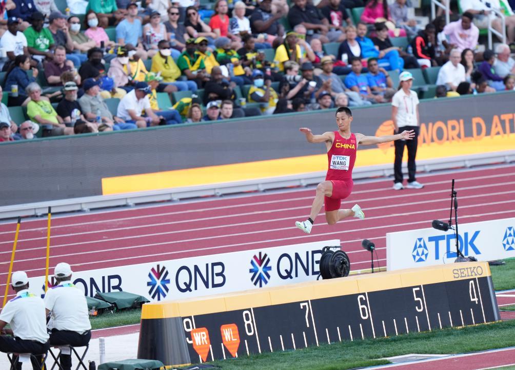 2022年7月16日,在美國俄勒岡州尤金市舉行的2022世界田徑錦標賽男子跳遠決賽中,中國選手王嘉男以8米36的成績奪得冠軍。新華社記者 王迎 攝