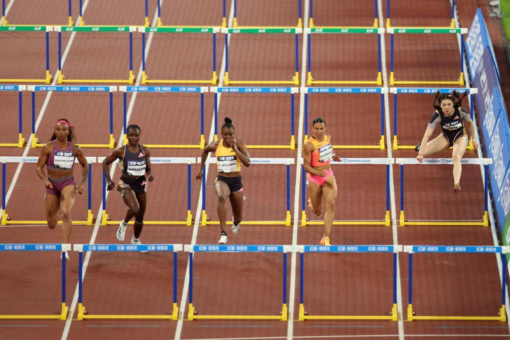 2024年4月20日,2024年世界田聯鉆石聯賽廈門站女子100米欄比賽中,中國選手吳艷妮(右一)以13秒04的成績獲得第十名。新華社記者 李明 攝