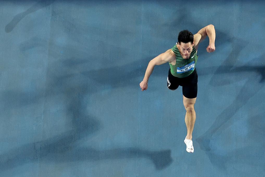 2024年3月16日,江蘇隊選手石雨豪在2024年全國室內田徑大獎賽(第4站)男子60米決賽后慶祝奪冠。 新華社記者 李明 攝