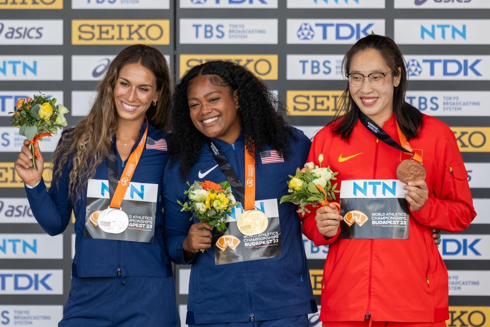 2023年8月23日,2023世界田徑錦標賽女子鐵餅冠軍美國選手陶薩加(中)、亞軍美國選手奧爾曼(左)與季軍中國選手馮彬在頒獎儀式上合影。新華社記者 孟鼎博 攝